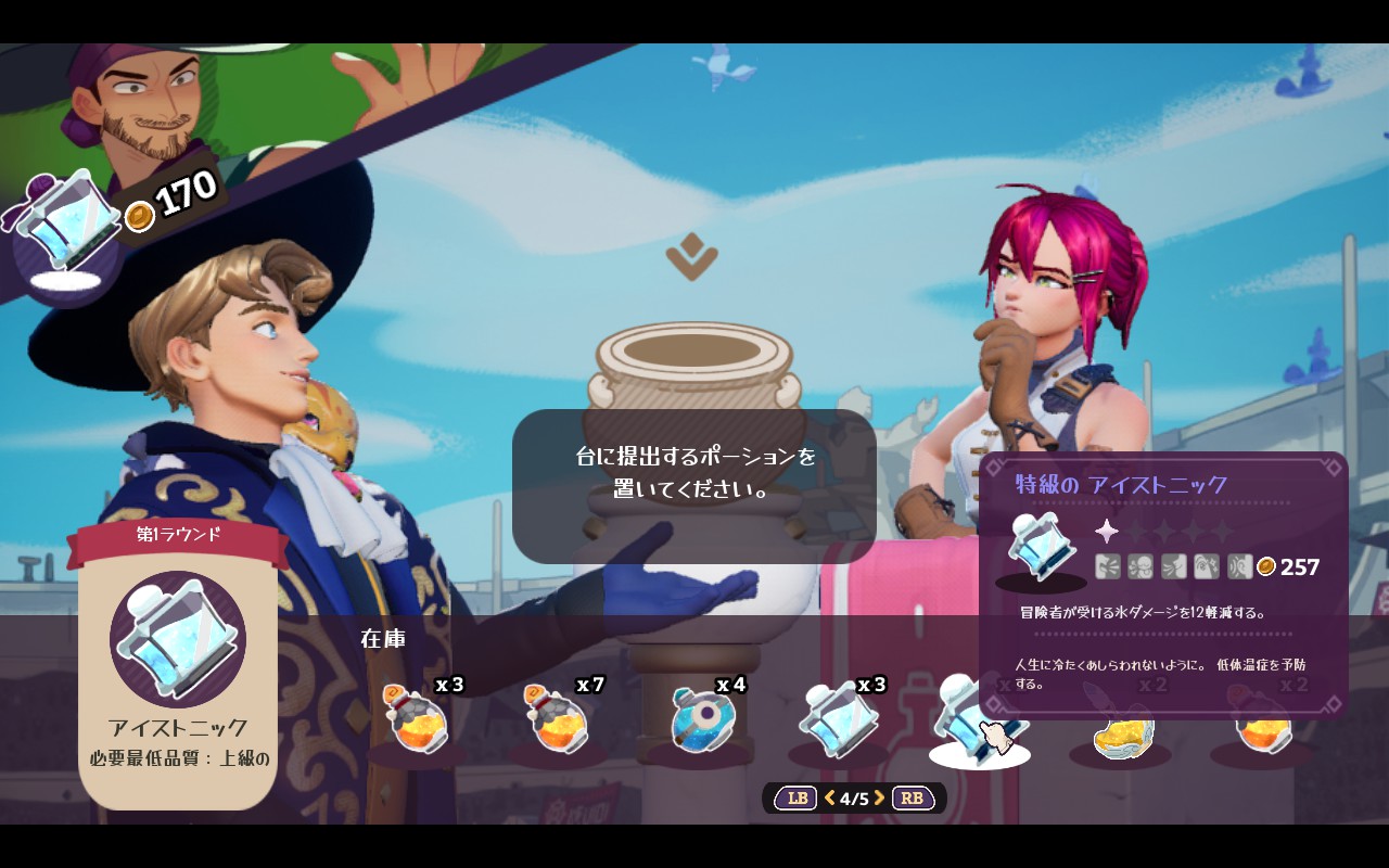 メインストーリーでの最重要イベント。コンテストは10日に1回のサイクルで開かれ、強制参加かつ優勝必須です。1日目にコンテストのお題であるポーション3種類が発表され、10日目までに準備が必要になります。日々のポーション作りやお店経営、お出かけ・キャラとの交流の中で残り日数を考えながら用意するのは結構難しかったです。