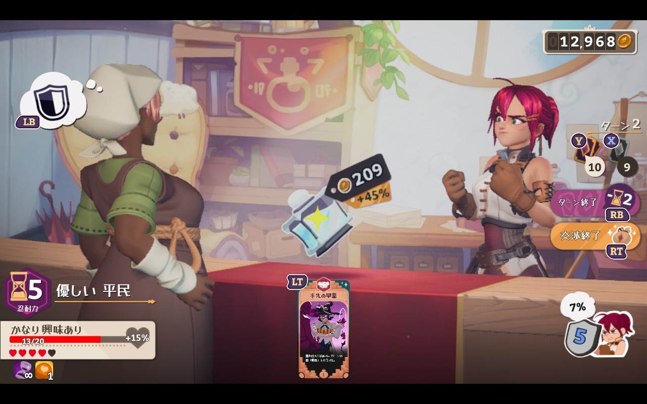 ポーショノミクスではお店を開店したらお客さんが勝手に買ってくれるではなく…お客さんとのカードバトル風な駆け引きが始まります。お客さんは値切るために商品の価値を下げようと文句を言ったり、シルヴィアにストレスをかけてきたりします。こちらは定価以上で売るためストレス管理しつつ応戦します。この現実にありそうな(?)やり取りを可視化したカードバトルになります。駆け出しシルヴィアの頃は使えるカードも少ないですが、友達やライバルたちの交流で成長していくうちに強力な手札を得ることも。